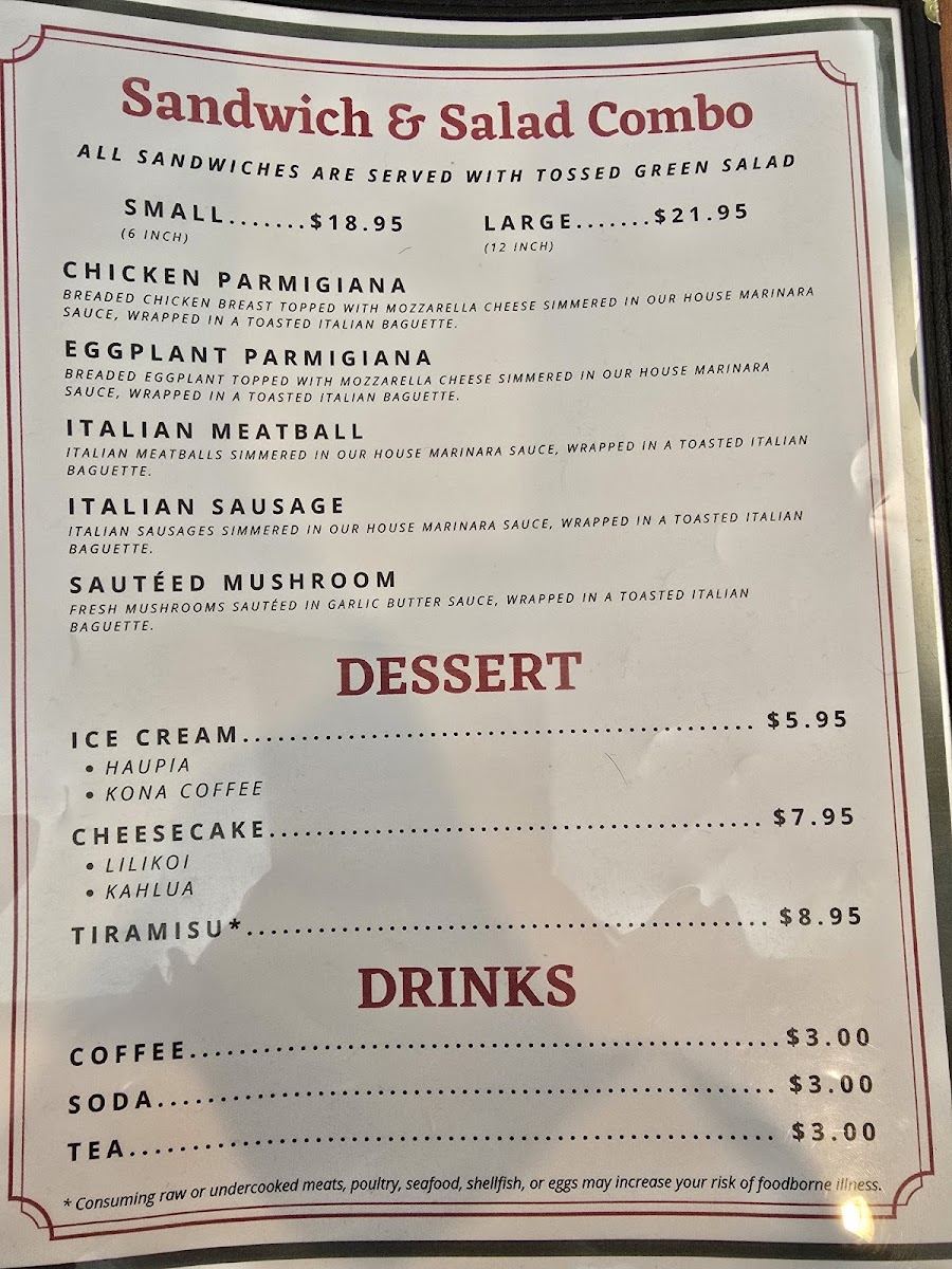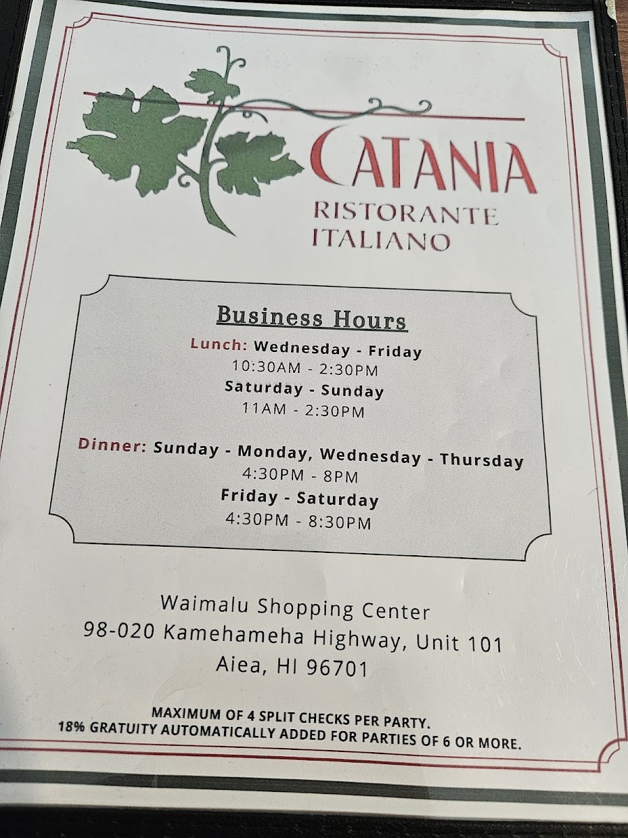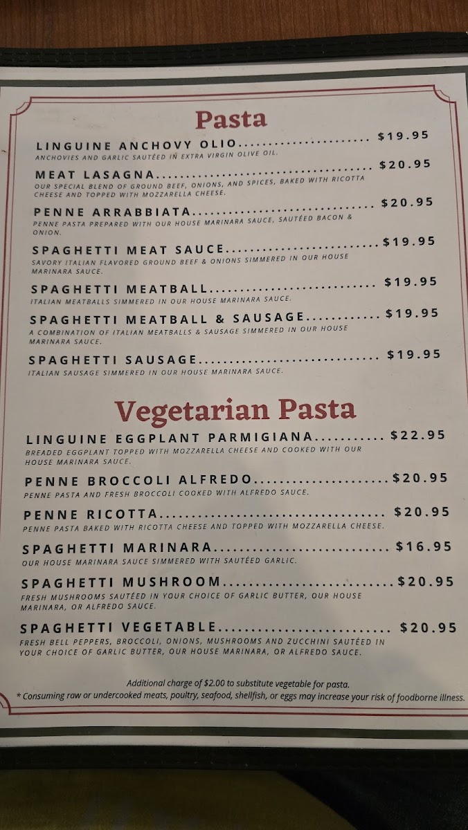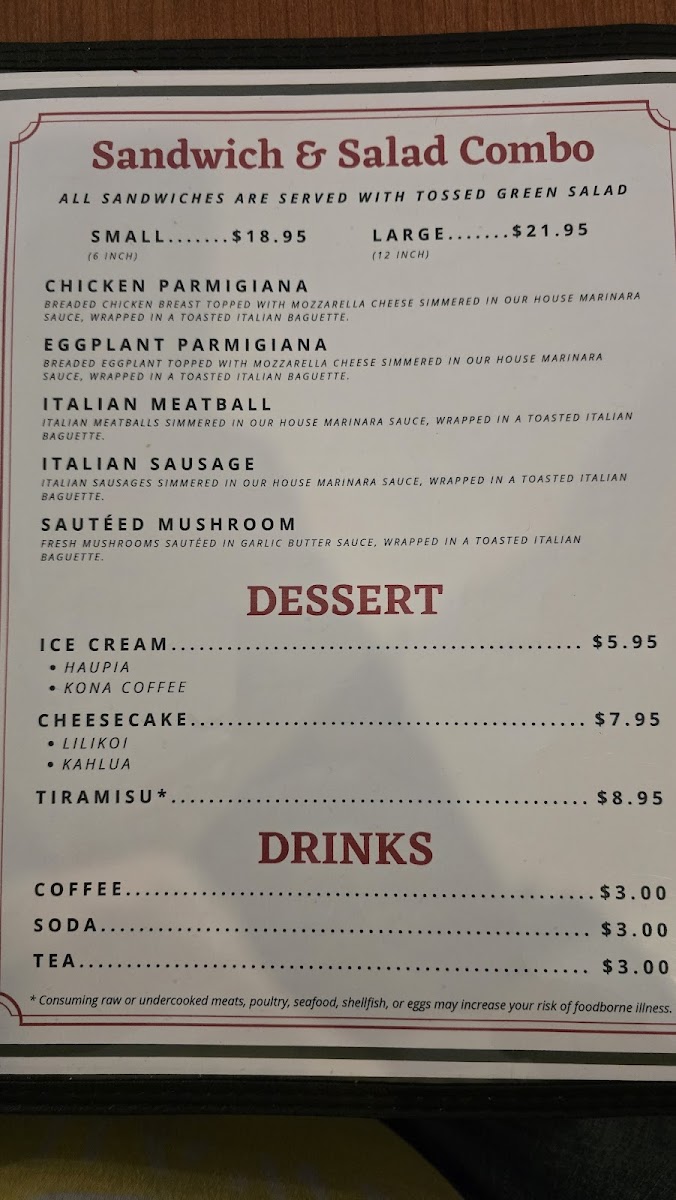 Catania Ristorante Italiano offers a diverse menu with a blend of classic Italian dishes, perfect for any occasion. Start with a fresh Caesar Salad or Italian Salad, or opt for a Tossed Green Salad to accompany your meal. For something heartier, the Sautéed Mushroom Sandwich and Italian Sausage Sandwich are great choices, and the Eggplant Parmigiana Sandwich is a flavorful vegetarian option. Appetizers like Hot Antipasto and Garlic Cheese Bread set the stage for a delicious meal. The restaurant also offers substantial party trays, such as the Large Tray Seafood Combo and Large Tray Chicken Alfredo, perfect for gatherings. For seafood lovers, the Clam Sauce, Shrimp Scampi, and Seafood Combo provide a satisfying taste of the ocean. A standout on the menu is the Chicken Florentine, while the Ribeye Steak and Chicken Parmigiana & Meatball offer delicious meaty options. Poultry fans will enjoy dishes like Chicken Marsala and Chicken Alfredo. Vegetarians can delight in the Penne Broccoli Alfredo or the Spaghetti & Vegetable, while classic pasta lovers can indulge in favorites like Spaghetti & Meatball & Sausage or Meat Lasagna. The variety ensures that every guest will find something to enjoy, with each dish crafted to highlight the rich flavors of Italian cuisine.